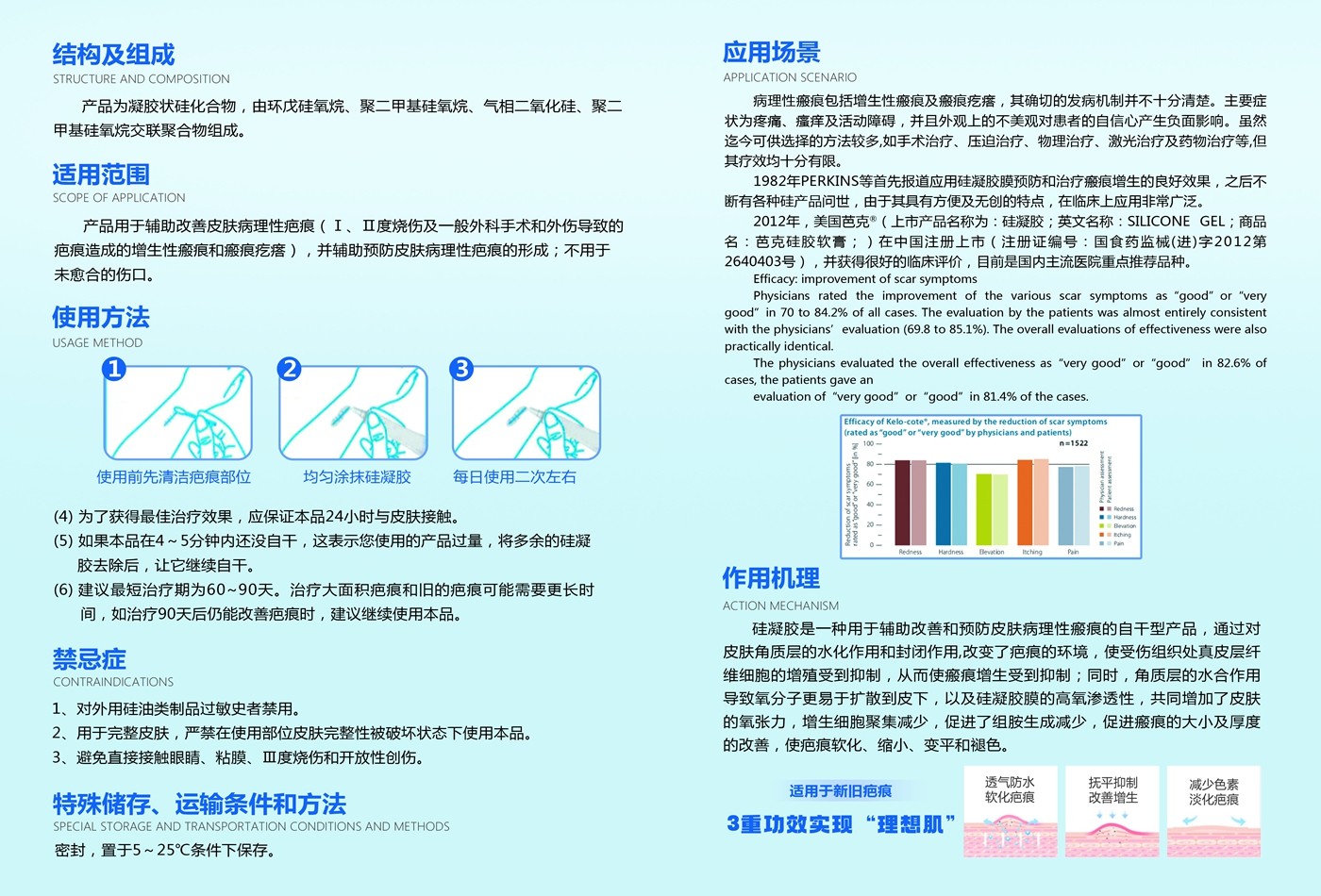 適用范圍:產品用于輔助改善皮膚病理性疤痕(Ⅰ、Ⅱ度燒傷及一般外科手術和外傷導致的疤痕造成的增生性瘢痕和瘢痕疙瘩),并輔助預防皮膚病理性疤痕的形成;不用于未愈合的傷口。