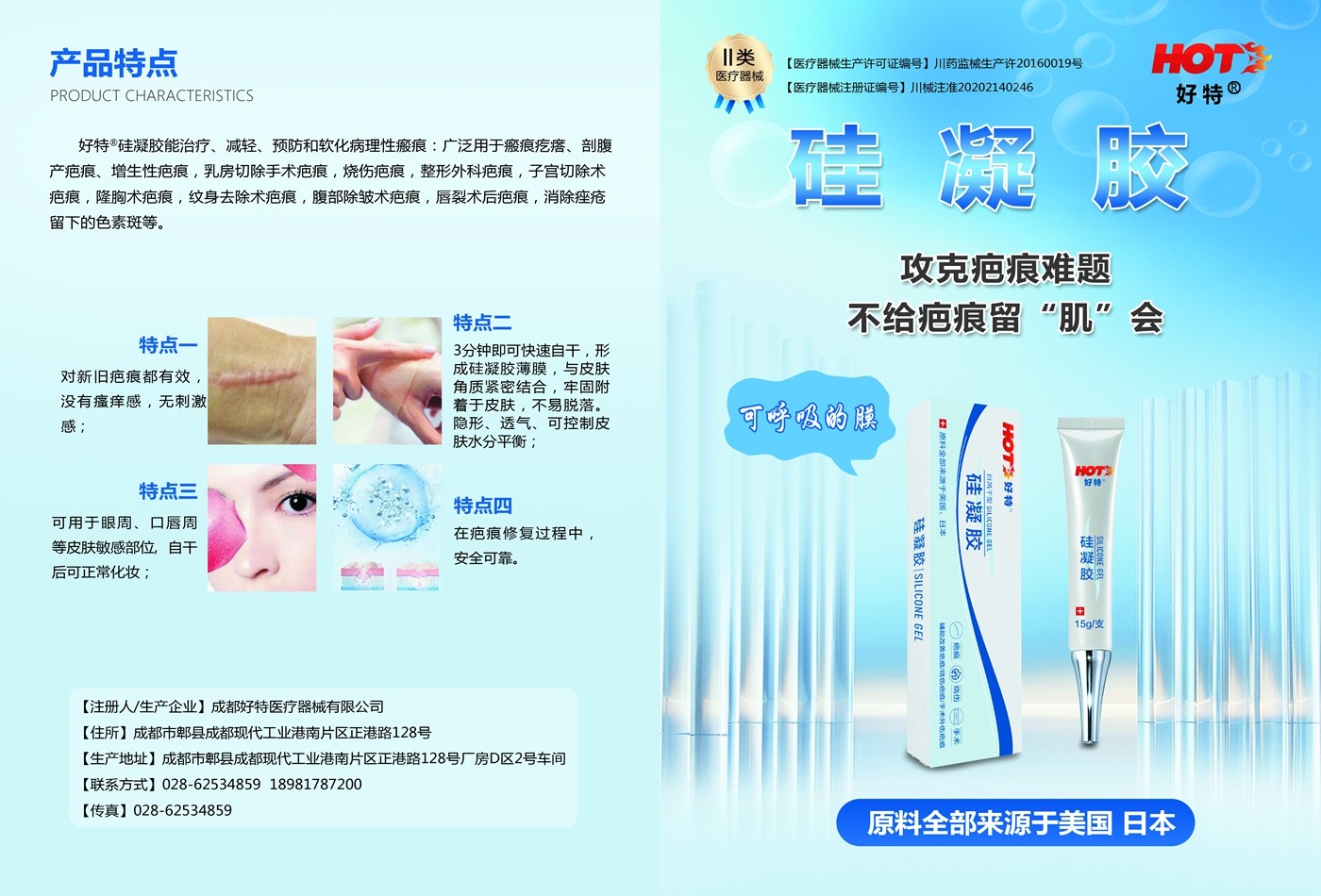 好特硅凝膠能治療、減輕、預防和軟化病理性瘢痕:廣泛用于瘢痕疙瘩、剖腹產疤痕、增生性疤痕,乳房切除手術疤痕,燒傷疤痕,整形外科疤痕,子宮切除術疤痕,隆胸術疤痕,紋身去除術疤痕,腹部除皺術疤痕,唇裂術后疤痕等,消除痤瘡留下的色素斑等。對新舊疤痕都有效,并且沒有瘙癢感;3分鐘即可快速自干,形成硅凝膠薄膜,與皮膚角質緊密結合,牢固附著于皮膚,不易脫落;隱形、透氣、可控制皮膚水分平衡;可用于眼周、口唇周等皮膚敏感部位, 自干后可正常化妝;在疤痕修復過程中,安全可靠。